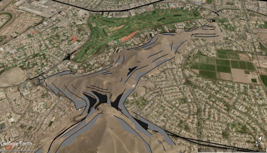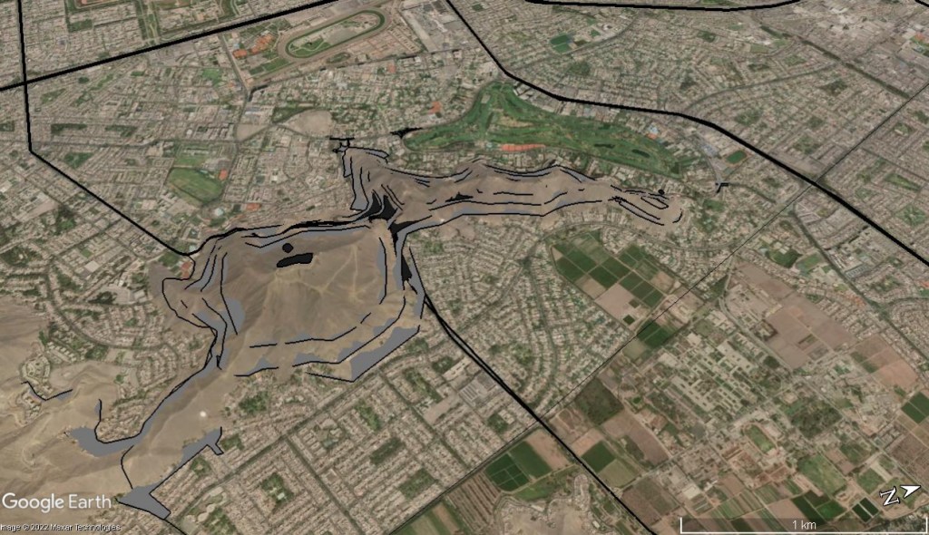 Sobre sus faldas corría una acequia que marcaba el limite original del fundo Camacho donde se habilito la parcelación Club Golf los Incas que mantuvo ese limite; después que la ladera oeste fuera anexada, entre esta acequia y la mitad de la ladera, se habilita la lotización semi rustica Cerros de Camacho dejando el resto de la ladera hasta las cumbres como un área de reserva para habilitación futura